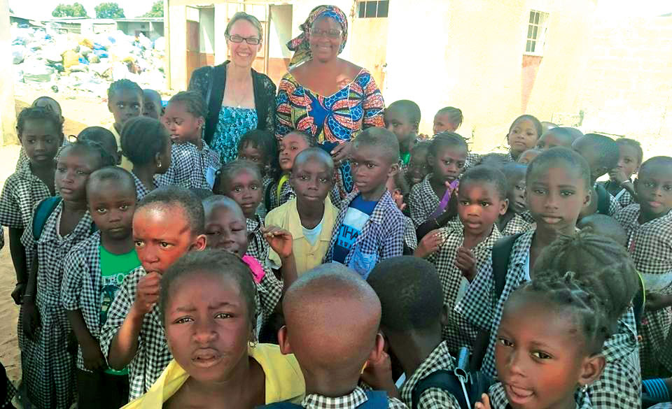 Photo: Mission partner Ann-Marie Wilson with a headteacher and pupils in a school in Kenya, on one of many trips raising awareness and sharing skills